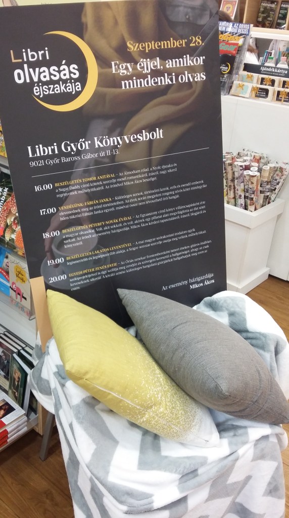 Végre sikerült részt vennem egy egész délutánt kitöltő, Az Olvasás Éjszakája rendezvényen. Már régóta szeretnék elmenni, és most Győrben volt rá lehetőségem. Már csak azért is szuper élmény volt, mert nemcsak hogy hallgathattam az írókat, Tomor Anitával néhány szót is tudtam váltani, és dedikáltatni a könyvemet. A programsorozat szeptember 28-án került megrendezésre és betelt vele a délutánom. Mondjuk épp, hogy beestem a kezdésre. A helyszínről annyit, a győri belvárosi Libri üzletben szorítottak helyet az íróknak és a közönségnek. Családias lett a hangulat így, bár többen jobban örültünk volna egy kicsivel tágasabb helyszínnek, esetlegesen valamilyen alkalomhoz illő berendezésnek. Az én benyomásaimon sokat rontott, hogy a gyerek részleg lett berendezve erre az alkalomra.