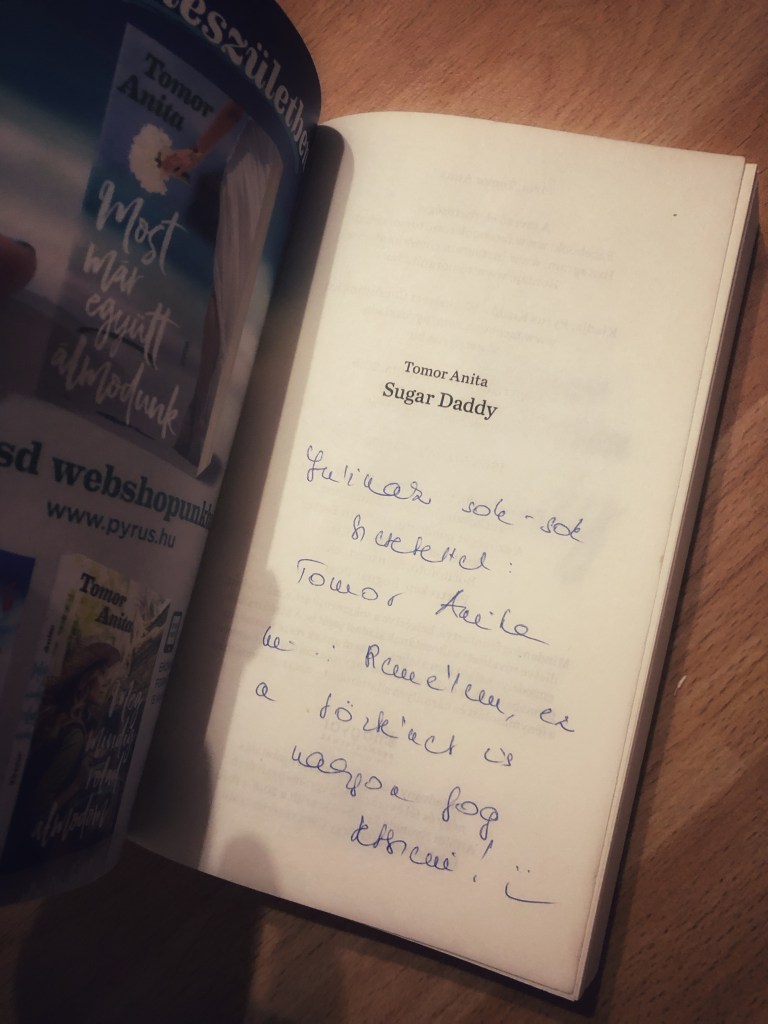 Szívesen hallgattam volna még az eszmecserét, sajnos egy órás időintervallum állt rendelkezésre, és még abba sem fértünk bele igazán, mert a dedikálásra is szakított időt az írónő. Én is aláírattam a tavaly karácsonyra kapott Sugar Daddy példányomat, bár még nem olvastam. Anita nagyon kedves volt, mindenkivel váltott pár szót, és minden aláírás után közös fotó is készült a rajongókkal (igen, igen, velem is). Nagyon örülök, hogy hallhattam, találkozhattam, beszélhettem vele. Szuper élmény volt.