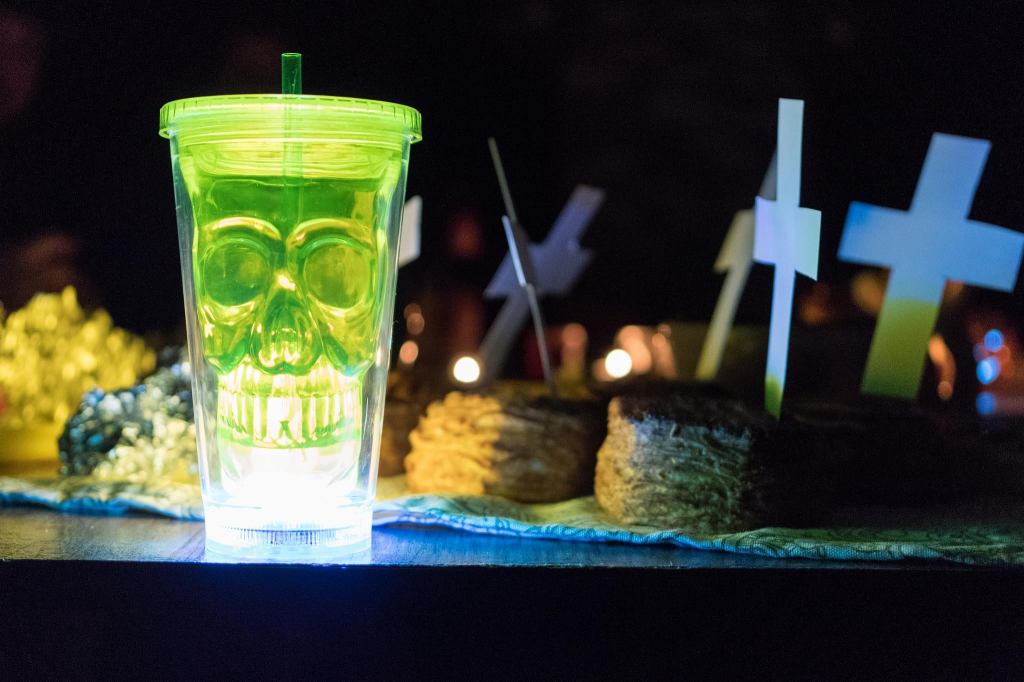 Szuper volt a hangulat, amiről a sejtelmes megvilágítás, a jobbnál-jobb dekorációk, és persze mi magunk is gondoskodtunk, mert akinek volt kedve beöltözött. Látszatra úgy néztünk ki, a félhomályban ülve mint egy alvilági kupaktanács, boszorkányokkal, élőholtakkal, vámpírokkal és annak áldozatával. Közöttünk az asztalon pislákoló kerámia töklámpások, apró szellemfigurák, itt-ott halványan fluoreszkáló csúszó-mászókat fedeztem fel, a helyenként elszórt sírfeliratokról már nem is beszélve. Aki megéhezett, temérdek finomságból válogathatott; pókháló chips, tökös-csokis sütemény, boszorkányok levágott ujjai, és a legnagyobb csendben elhangzott ez a mondat is: “Kaphatok egy agyat?”. Na jó, nem igazit, gumicukorból valót.